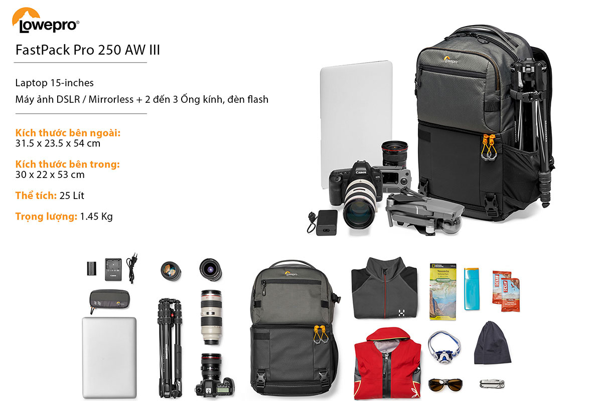 Fastpack Pro 250 AW III là một trong những balo máy ảnh cao cấp bảo vệ tốt cho thiết bị của hãng Lowepro. Chất liệu cao cấp chống nước, chống mài mòn cùng những dây kéo chất lượng cao tạo nên một chiếc balo vô cùng hoàn hảo. Với thể tích chứa 25L cùng kích thước ngoài là 31,5 x 23,5 x 54 cm, balo có thể chứa được 01 Body DSLR hoặc Mirrorless + 2-3 lenses + 1 flash. Ngoài ra balo máy ảnh Fastpack Pro 250 còn có thể đựng laptop 15 inch, tripod hoặc bình nước và nhiều vật dụng cá nhân nhỏ khác.
