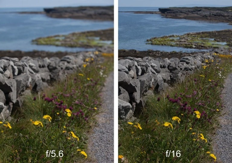 Khẩu độ nhỏ hơn (số f/x với x càng lớn), sẽ cho độ sâu trường ảnh càng tuyệt vời hơn. Điều này cũng giải thích, đừng để khẩu độ nhỏ hơn mức f/16, việc này có thể sẽ ảnh hưởng độ mềm mại của bức ảnh. Để cài đặt phần này, chọn chế độ Aperture Priority (A/Av), tiếp đó dùng dial để chọn khẩu độ.