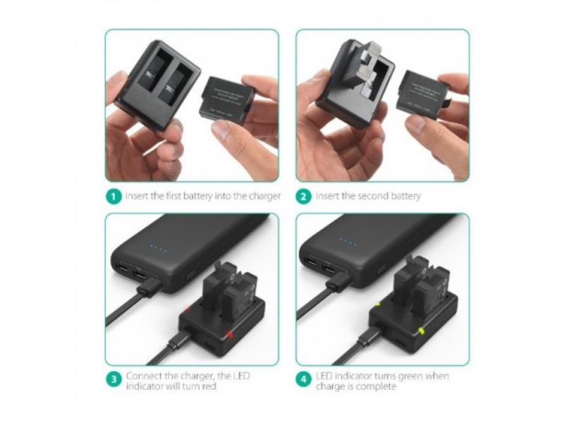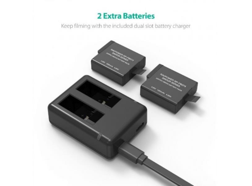 Bộ 2 pin và sạc kép RAVPOWER RP-PB074 là lựa chọn dự phòng hoàn hảo cho bạn với một sạc kép cho phép sạc hai pin cùng lúc và hai pin thay thế có thời lượng 1260 mAh mỗi pin giúp tăng thời lượng sử dụng lên gấp đôi: quay video 4K thời lượng 174 phút, trong khi pin theo máy chỉ quay trong 70 phút.