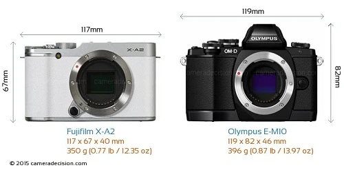 Về ngoại hình, Fujifilm X-A2 và Olympus E-M10 có khối lượng và kích thước khá tương đồng với nhau. Máy ảnh Fujifilm X-A2 nặng 350g với kích thước 117 x 67 x 40mm còn Olympus E-M10 nặng 396g với kích thước 119 x 82 x 46mm. E-M10 nổi bật với kính ngắm còn X-A2 lại. . .