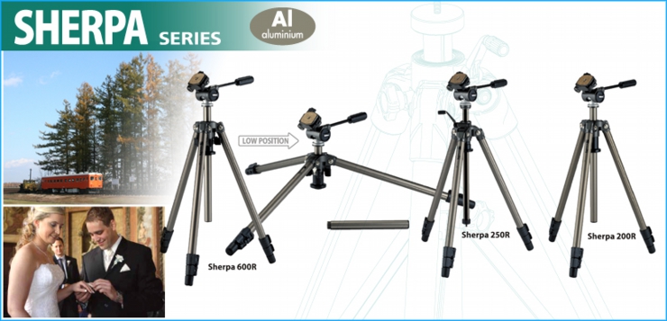 Dòng Sherpa mới có sẵn với đầu gắn kèm, hoặc một hoặc hai tay cầm hoặc với đầu ball và đầu cắm. Chân được thiết kế với 3 hoặc 4 phần. Dòng Sherpa hiện nay cung cấp giá chân máy với nhiều cấu trúc khác nhau cho các đường kính chân đa dạng, bao gồm các dòng có cột trung tâm 2 phần có thể tháo rời cho phép chụp góc thấp bằng cách mở hoàn toàn chân khi phần dưới được tách ra. Với các dòng chân máy có góc cố định mở chân và cột trung tâm không thể tháo rời sẽ không cho phép chụp ở góc thấp.