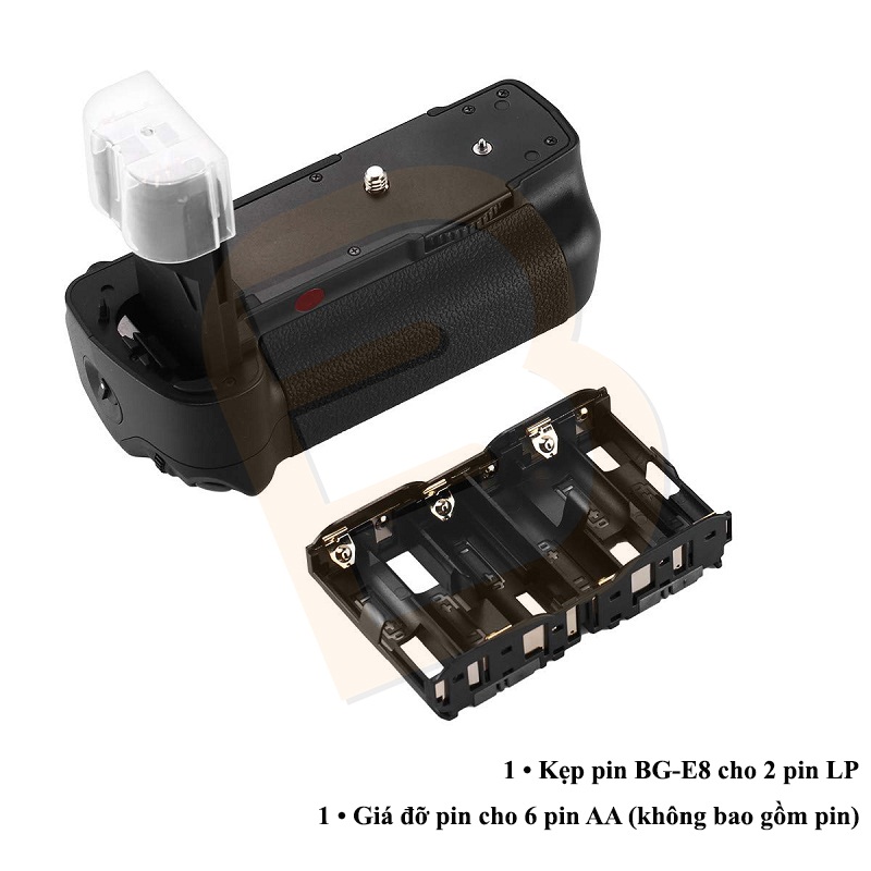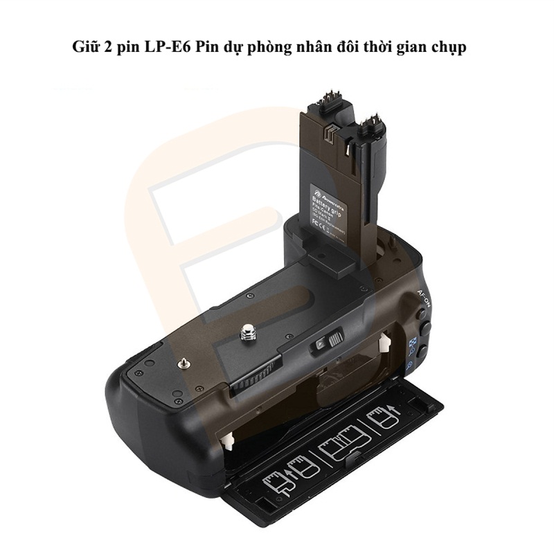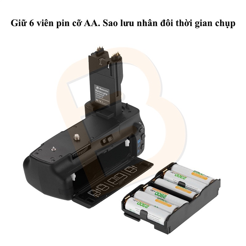 –  Đế pin for Canon này dùng hai Pin Canon LP-E6 (pin Lithium-ion) hoặc sáu Pin tiểu loại “AA”.