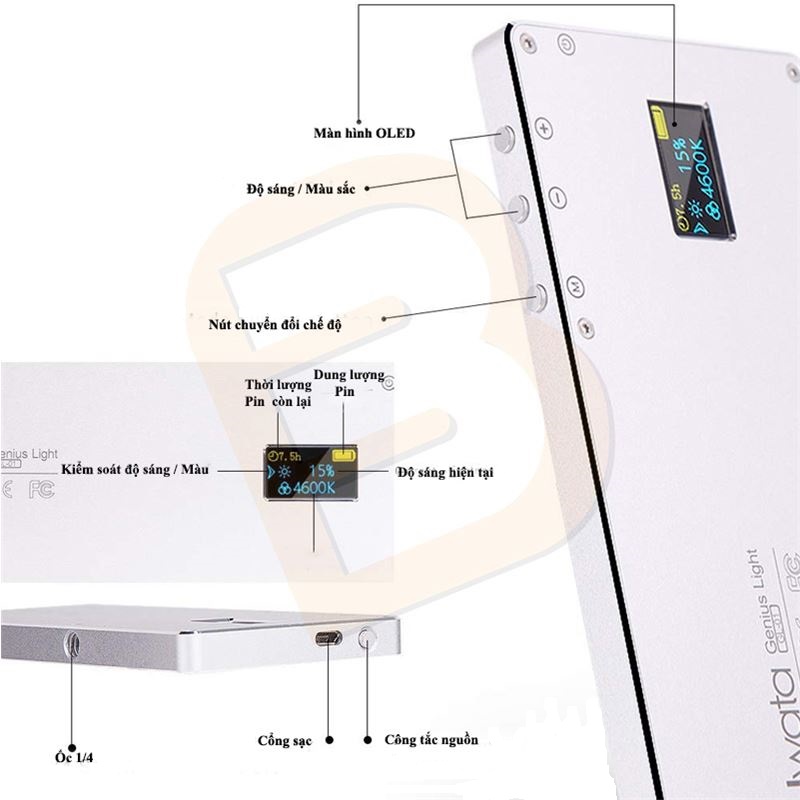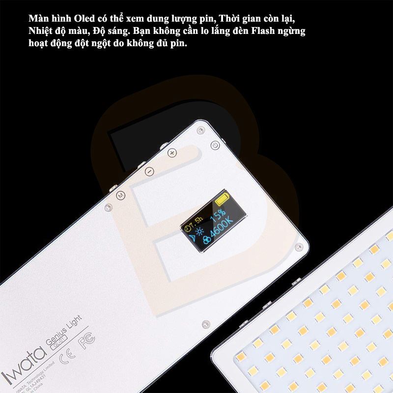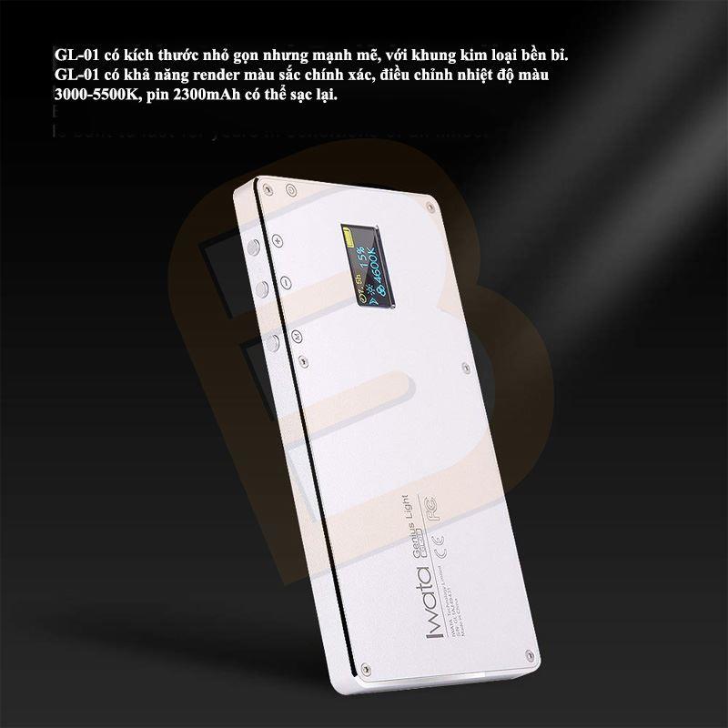 Đèn Led Iwata GL 01 có kích thước nhỏ gọn nhưng mạnh mẽ, với khung kim loại bền bỉ. GL-01 có khả năng render màu sắc chính xác, điều chỉnh nhiệt độ màu 3000-5500K, pin 2300mAh có thể sạc lại, tương thích rộng rãi với ốc 1/4 và cold shoe theo chuẩn quốc tế và màn hình hiện thị kỹ thuật số OLED, là giải pháp chiếu sáng kích thước bỏ túi mạnh mẽ hữu dụng nhất.