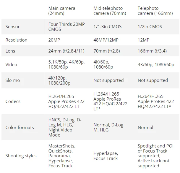 Cụm 3 camera bao gồm: camera chính Hasselblad với cảm biến 4/3 inch CMOS có khả năng quay 5,1K /50 fps và 4K 120fps với khẩu độ f/2.8 – f/11. Chế độ D-Log 10-bit M Mode có khả năng ghi lại lên tới một tỷ màu (với tiêu cự 24mm).