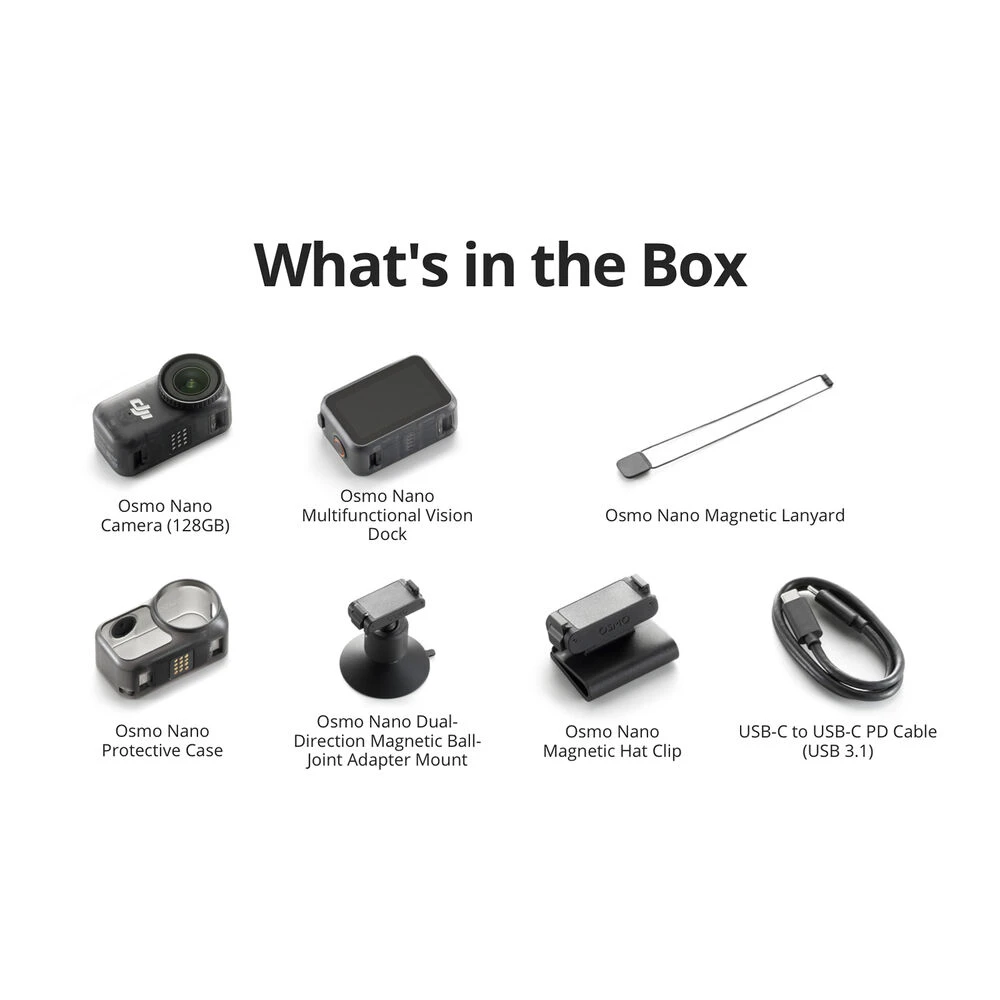 - Osmo Nano Magnetic Hat Clip Secure, Osmo Nano Magnetic Lanyard, DJI Osmo Magnetic Headband và Osmo Magnetic Chest Strap: dễ dàng gắn camera lên mũ, đeo cổ, đội đầu hoặc gắn ngực, giải phóng đôi tay để quay vlog, thể thao hay hoạt động ngoài trời.