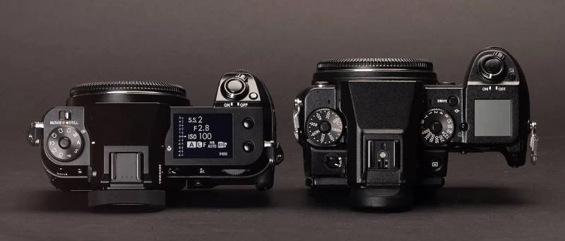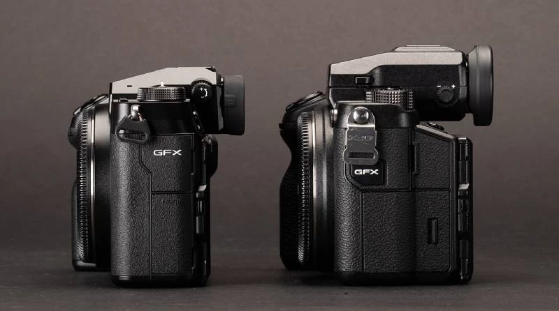 GFX100S (trái) là một máy ảnh nhỏ hơn đáng kể so với GFX 50S ban đầu (phải) và nó loại bỏ vòng quay tốc độ cửa trập và quay số ISO để giảm kích thước thân máy. Đổi lại, GFX 100S  sẽ có được một màn hình lớn trên cùng, có thể tùy chỉnh và thêm nút gạt chế độ AF mới để cố định khả năng lấy nét tự động, hỗ trợ người dùng thao tác máy khi di chuyển mà vẫn lấy nét tập trung.