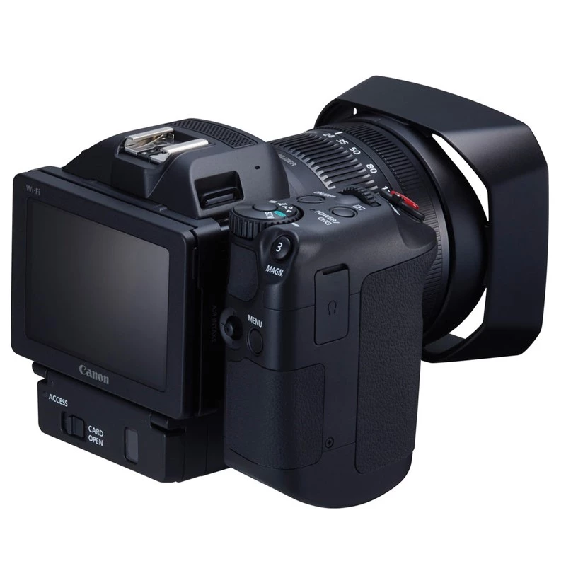 Về mặt ngoại hình thì máy quay khá dị với thiết kệ thân máy hình khối hộp. Phần báng tay cầm được làm rời rạc và có thể xoay tròn 180 độ. Canon cho biết báng tay cầm này được thiết kế đặc biệt để vừa khít với tư thế cầm của người dùng, một cách hoàn hảo. Phía mặt sau của máy là màn hình LCD lớn 3 inch với độ phân giải 1,030,000 (độ phủ 100%). Canon cũng bổ sung một bộ phóng đại LCD quang học để tăng cường trải nghiệm chụp ảnh. Phía trên chỉ có cổng hot shoe, còn lại tất cả các phím chức năng, bánh xe chỉnh chế độ đều dồn vào phía trên của báng tay cầm. Phần đáy của máy chỉ có cổng gắn chân đế tiêu chuẩn.
