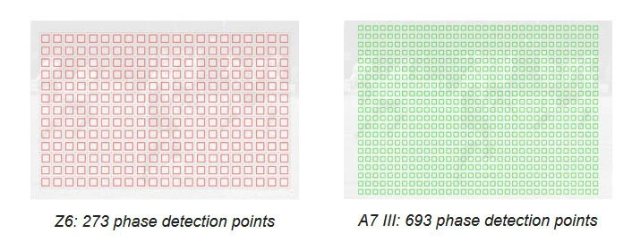 Cả hai máy ảnh đều có các điểm lấy nét bao phủ phần lớn khung ngắm, nhưng Nikon thực hiện với 273 điểm AF, trong khi Sony thực hiện với 1118, bao gồm 693 điểm phát hiện pha (và 425 điểm lấy nét tương phản). Đây là một sự khác biệt khá ấn tượng: Nikon có khoảng 25% số điểm AF mà Sony thực hiện.